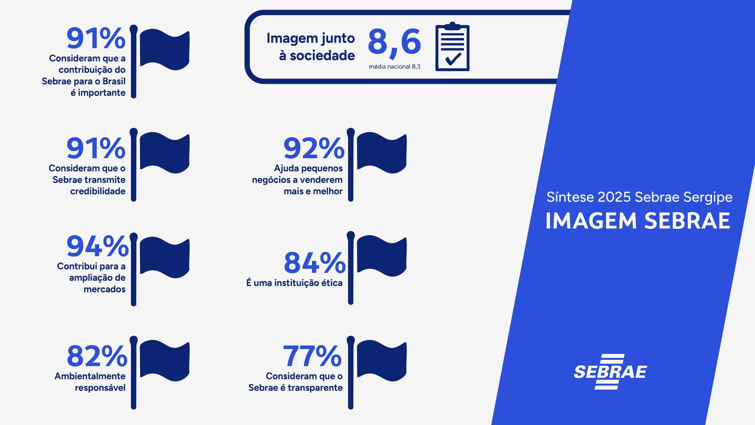 De acordo com os dados, 91% dos entrevistados consideram que o Sebrae transmite credibilidade e reconhecem que sua contribuição para o Brasil é importante. A avaliação geral da imagem da instituição junto à sociedade atingiu nota 8,6, acima da média nacional, que é de 8,3.